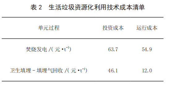 其他垃圾主要是指除厨余垃圾、可回收垃圾、有害垃圾以外的生活垃圾。该类垃圾可分为可燃与不可燃垃圾。目前国内外针对该类终端处置方式主要有以下几种:一是对该类垃圾进行分拣、粉碎等程序处理,用于水泥厂原料和辅助燃料;二是对其焚烧处理,如进入热解气化厂或焚烧发电厂。据调研,国内10个炉排炉垃圾焚烧厂,辅助燃料主要是0#轻柴油,吨垃圾发电量为231~380kW·h、吨垃圾净发电量230~379kW·h、吨垃圾上网电量184~326kW·h,吨垃圾净上网电量184~317kW·h;三是进入填埋场填埋处理。2006年,日本焚烧处理量占垃圾总产生量的75%,直接填埋的生活垃圾不足3%。德国要求进入填埋场的垃圾中总有机碳(TOC)要小于5%,即垃圾需经过焚烧处理后,才能进入填埋场填埋处理。目前我国生活垃圾主要通过焚烧发电、卫生填埋方式处置,比较两者投资和运营成本,其中投资成本含土地、土建、设计、设备与安装费用;运行成本含能源/原材料、运行、工资和其他支出费用,其具体情况见表2。