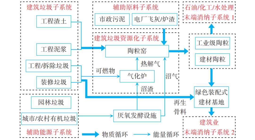 “无废城市”背景下,构建上述多源固废协同处置系统、优化产品结构和能源消耗、共建共享基础设施来实现物质和能源的双流循环,提高系统产出效率和质量,是促进建筑垃圾资源化产业发展的系统性思维。系统功能能否实现,还有待于在一些关键技术上取得突破,同时也需要政府出台相关政策、制定规范标准及加大金融支持力度。