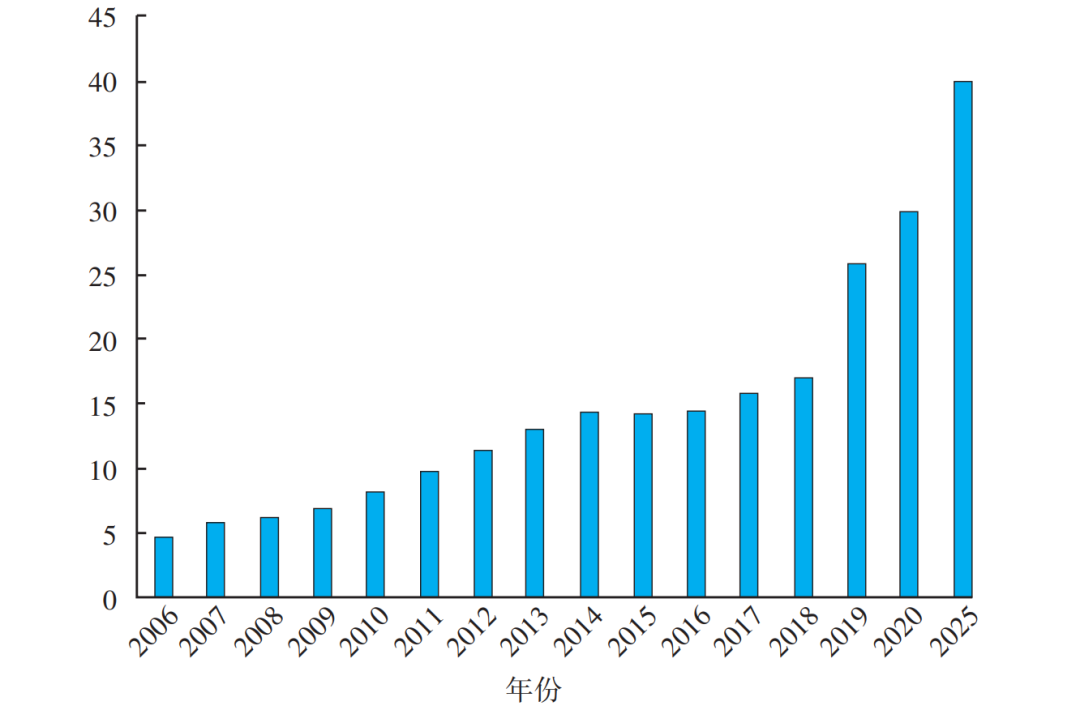 建筑垃圾是新建、改(扩)建、拆除各类建(构)筑物、管网、道桥等以及房屋装饰装修过程中产生的废物总称,主要包括工程渣土、废弃泥浆、工程垃圾、拆除垃圾和装修垃圾等。据中国环联公布的数据,当前我国建筑垃圾已占城市垃圾总量的40%以上,建筑垃圾年产生量超过3.0×109t,预计2025年将达到4.0×109t,如图1所示。但目前大中城市的建筑垃圾资源化率不超过10%,与日本、德国、美国等发达国家的建筑垃圾资源化水平差距较大。